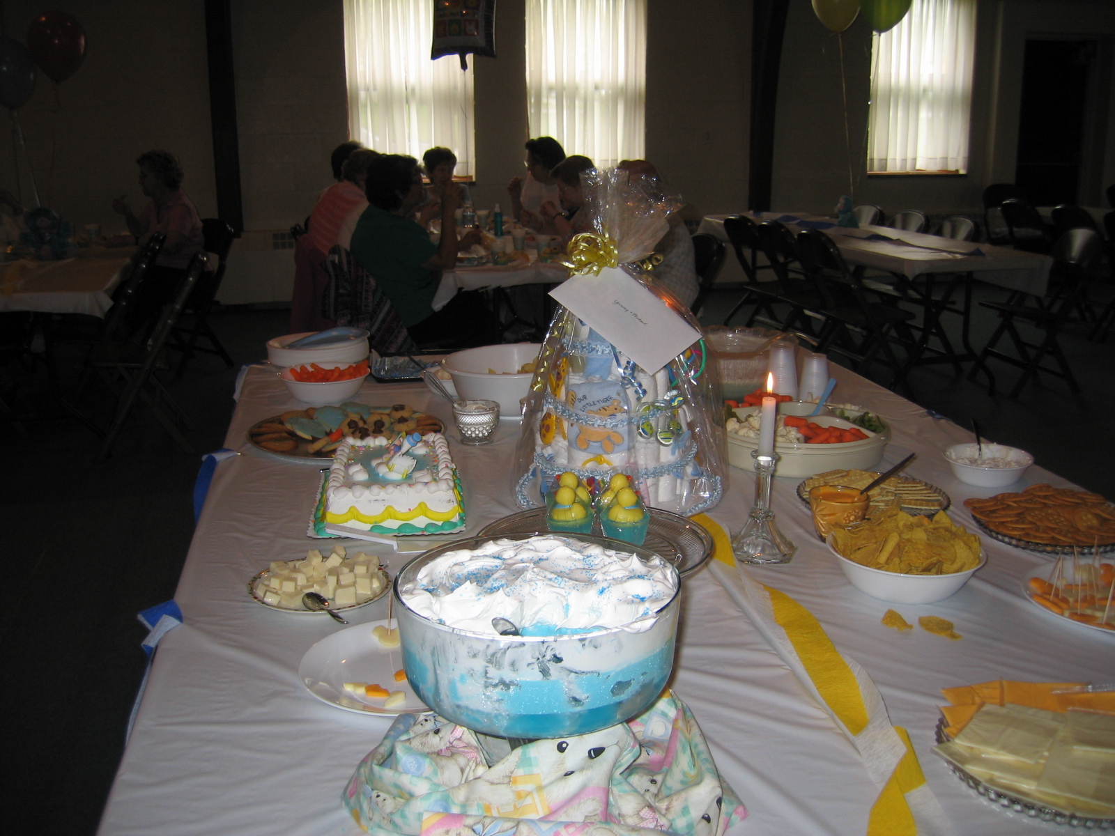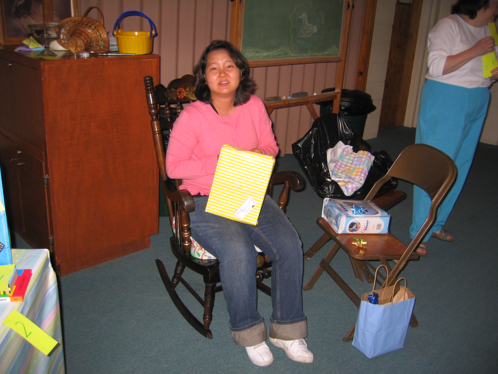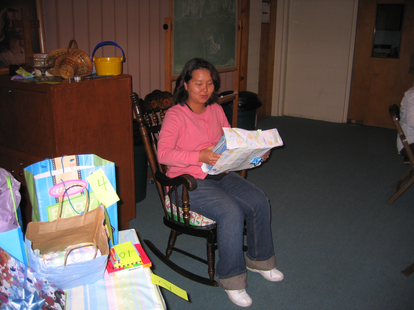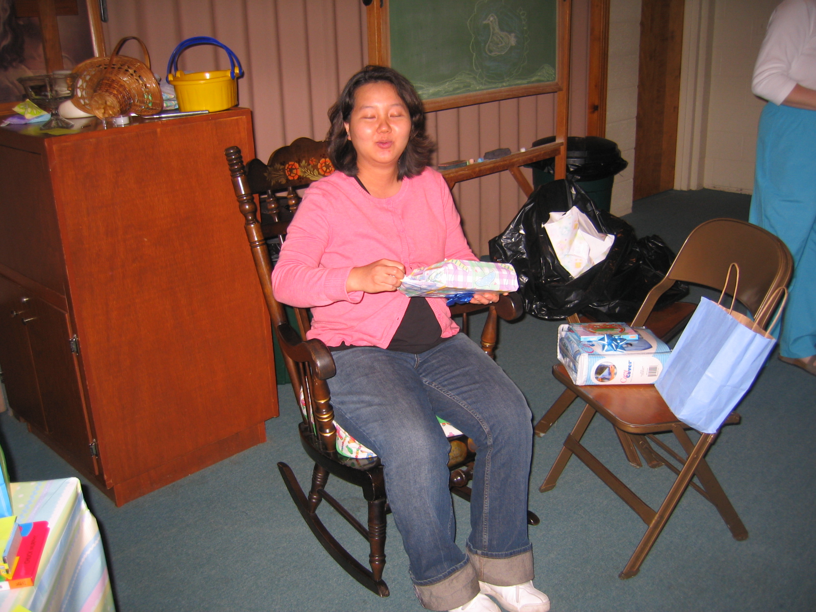 那天的party 是在1點鐘開始, 因為老公有點事, 所以我先跟著美國媽到逹教會, 一進教會就看到有好多位的女人在忙著做點心跟布置會場了, 有十几人耶. 還看到了有好多禮物放在台子上, 是準備待會兒送給我們寶寶的. 我看了都好高興喔. 立即走回美國媽家拿照相機(因為我以為人不多, 免得拍照了, 人太少拍了難看嘛)