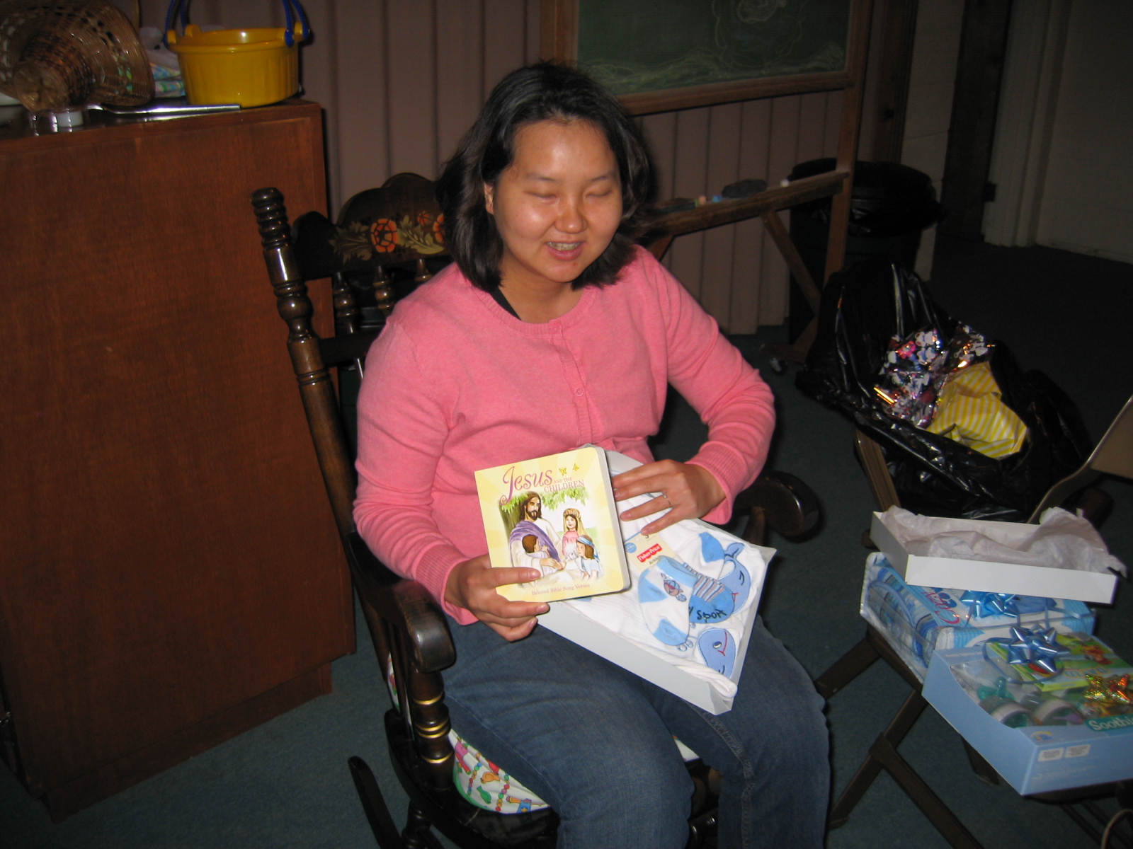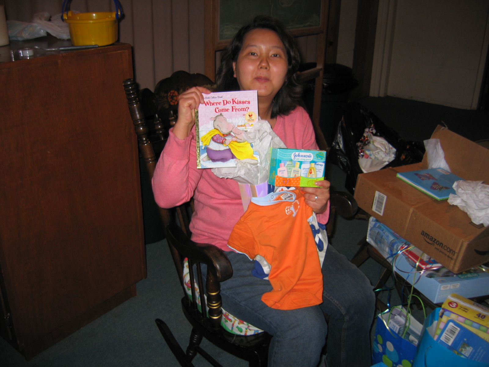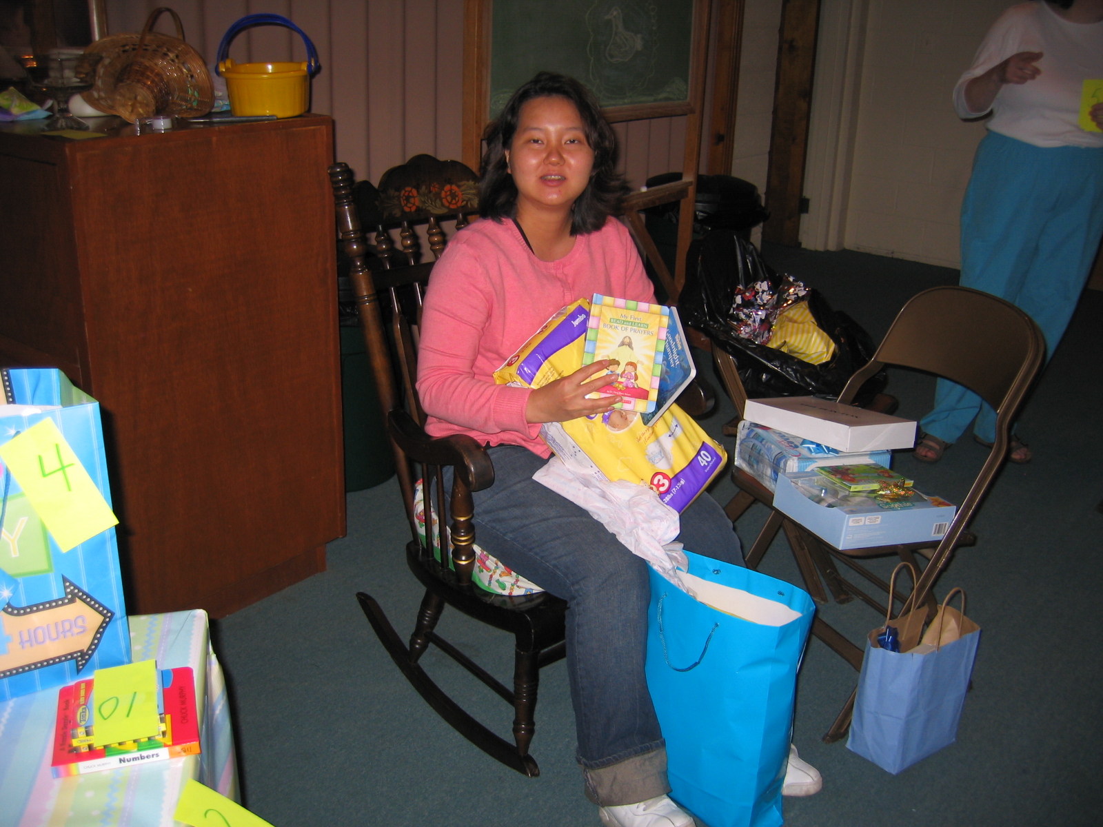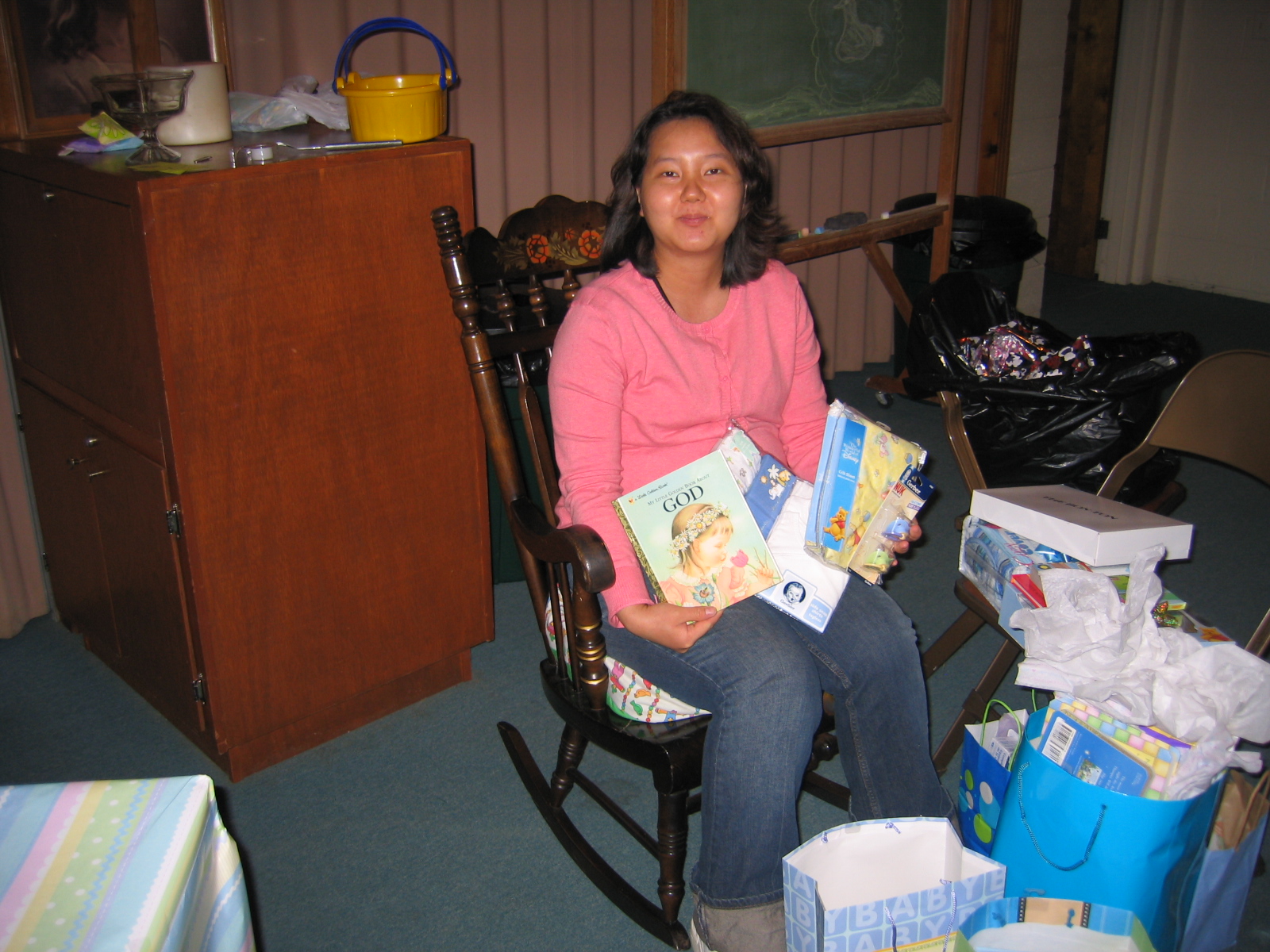 那天的party 是在1點鐘開始, 因為老公有點事, 所以我先跟著美國媽到逹教會, 一進教會就看到有好多位的女人在忙著做點心跟布置會場了, 有十几人耶. 還看到了有好多禮物放在台子上, 是準備待會兒送給我們寶寶的. 我看了都好高興喔. 立即走回美國媽家拿照相機(因為我以為人不多, 免得拍照了, 人太少拍了難看嘛)