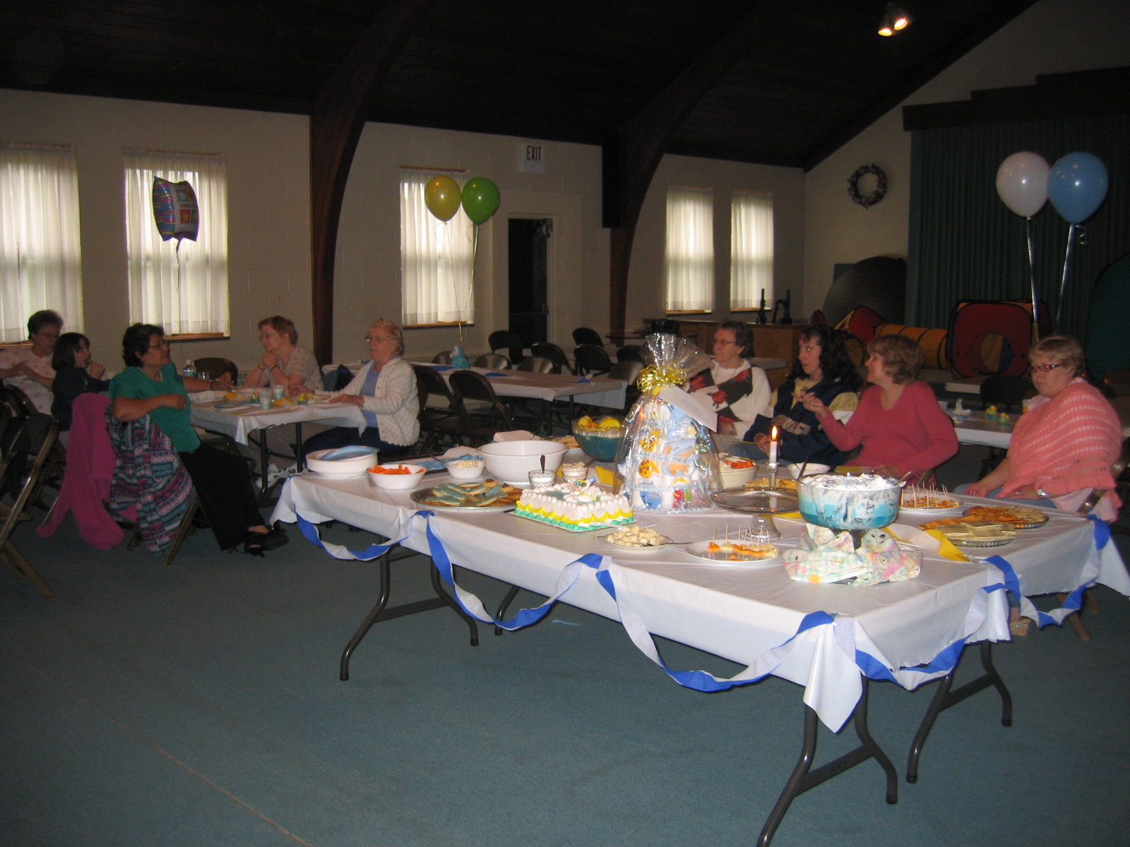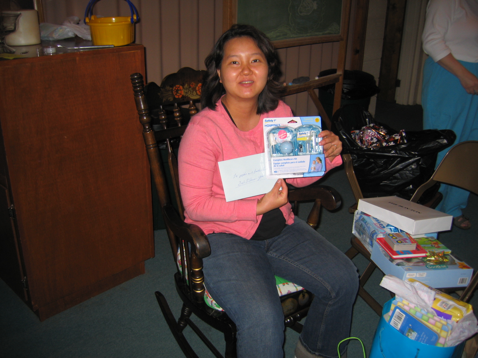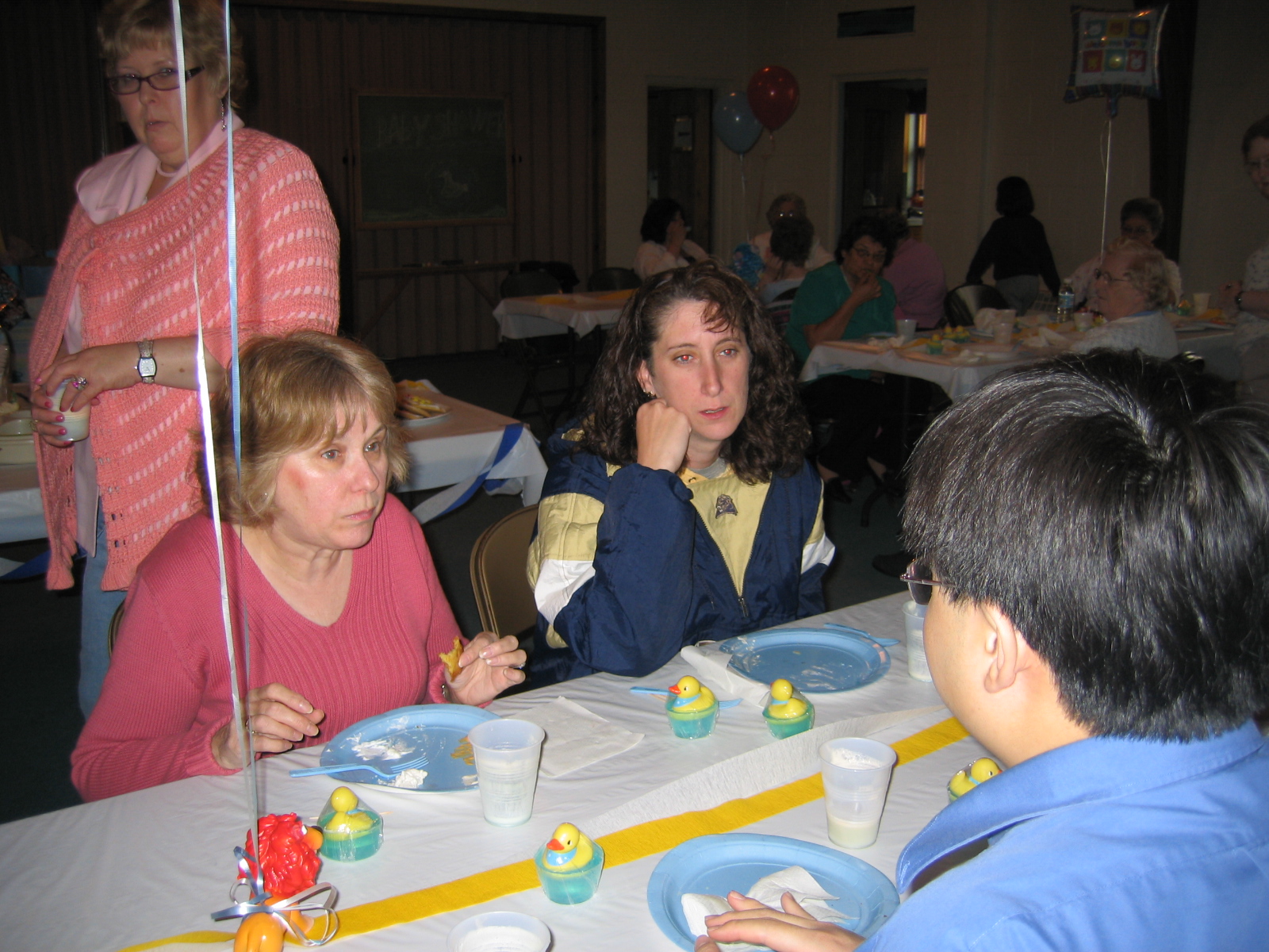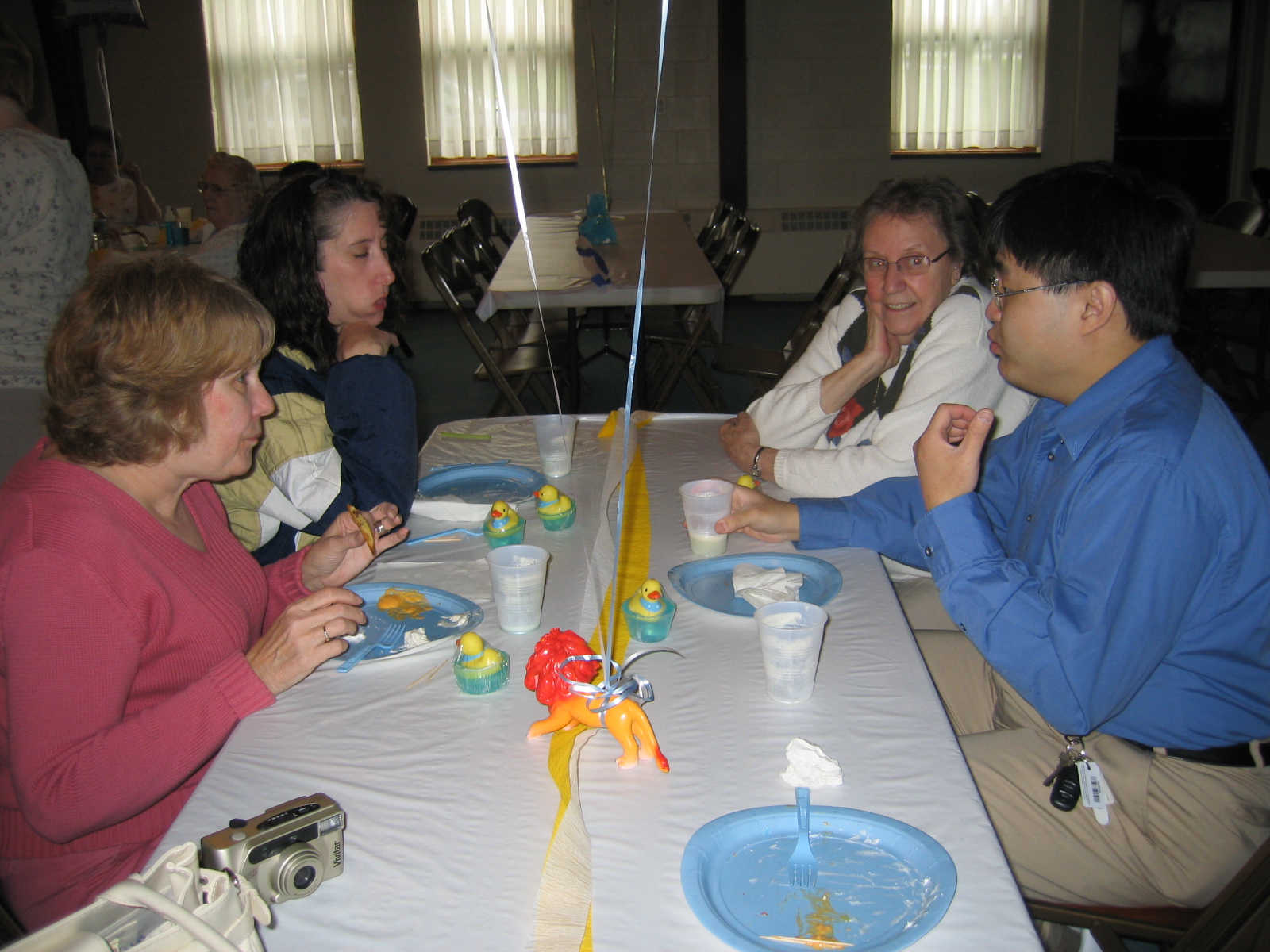那天的party 是在1點鐘開始, 因為老公有點事, 所以我先跟著美國媽到逹教會, 一進教會就看到有好多位的女人在忙著做點心跟布置會場了, 有十几人耶. 還看到了有好多禮物放在台子上, 是準備待會兒送給我們寶寶的. 我看了都好高興喔. 立即走回美國媽家拿照相機(因為我以為人不多, 免得拍照了, 人太少拍了難看嘛)