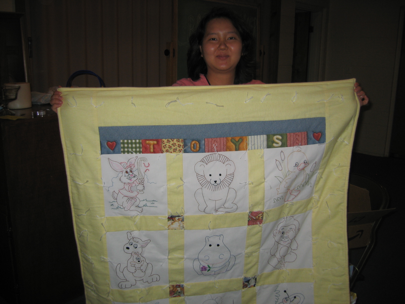 因為我是大肚婆, 所以有特權, 可以坐在台上折, 而老公就幫我拿跟拍照片. 我們收到好多禮物喔. 很多都很可愛也很有心思喔. 其中最讓我喜歡的就是兩張小被子啦. 兩張都是兩個奶奶送的. 黃色的是上面綉著小動物, 用人手做的喔. 另外一張就是用毛線抅織出來的, 這個奶奶還八十几歲了耶. 都很費時間跟心思啊. 我看到就好想哭喔, 感覺好溫暖喔!