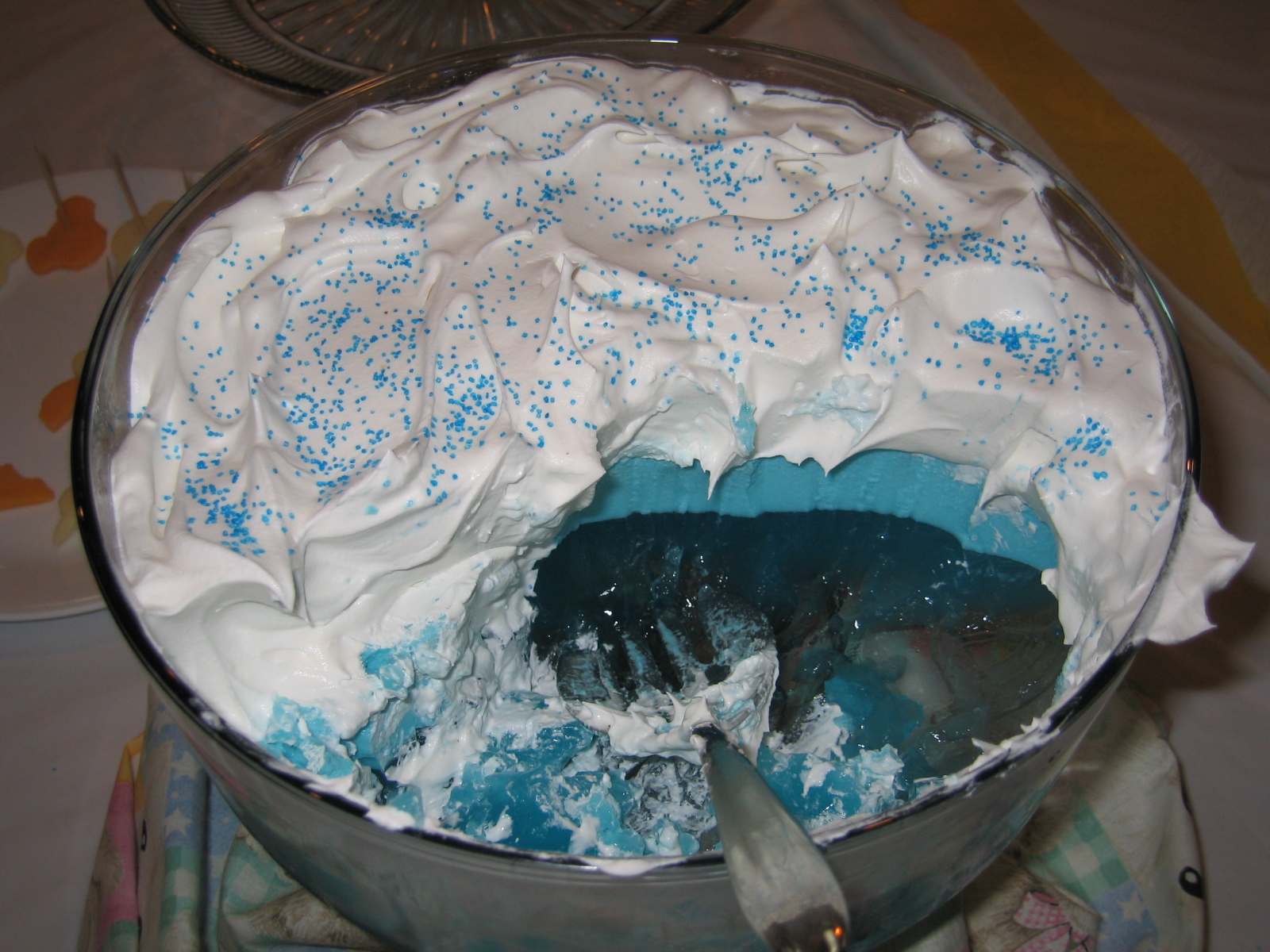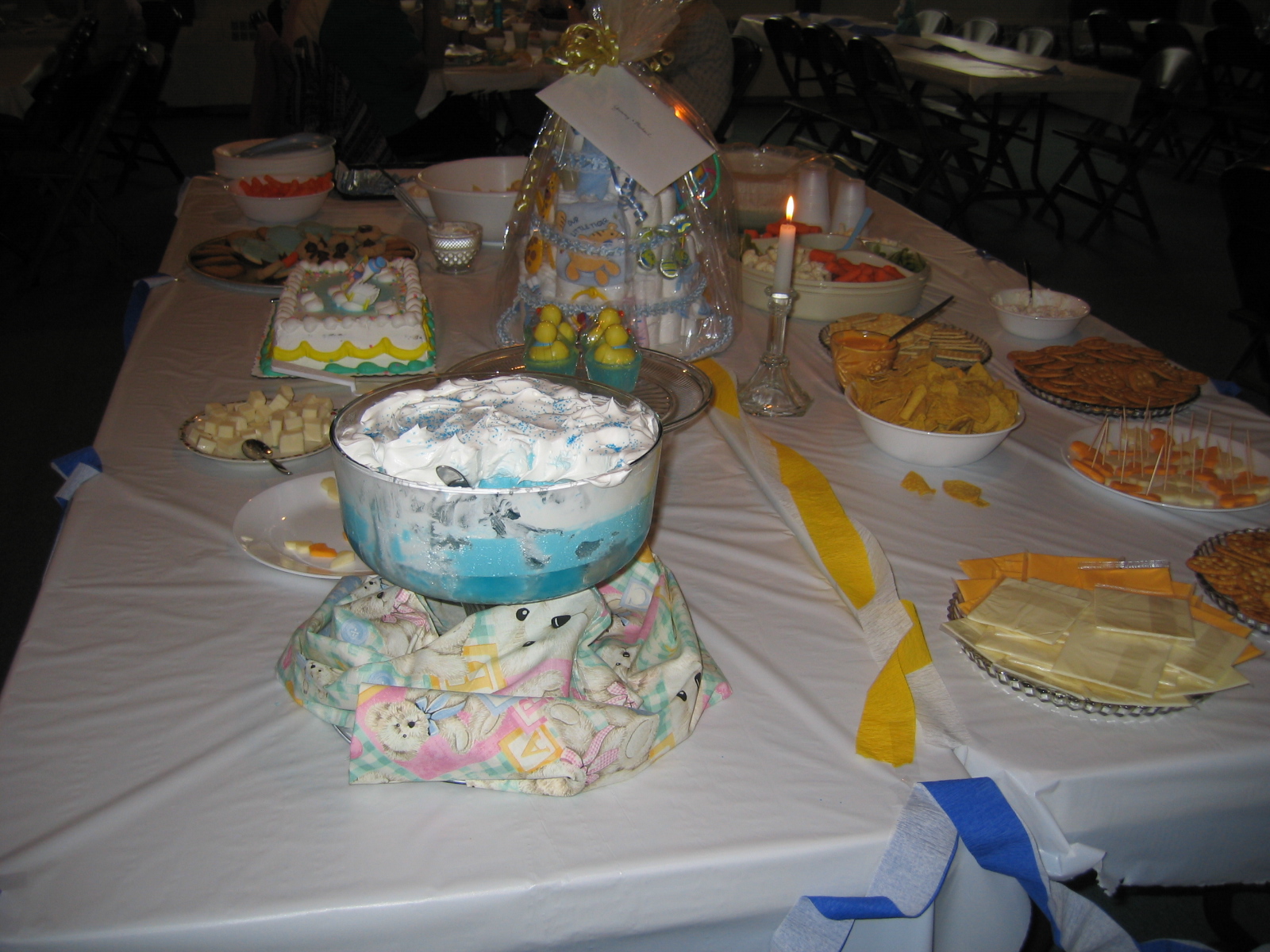 其實這個party 都是女人出席的, 但因為我的芵文不好, 還有就是她們認識我也因為我老公, 所以我老公也破例的出現會場啦. 還有的就是, 在美國啊, 如果是買給男生的東西, 大多都會買藍色, 女生就是粉紅色. 因為我們寶寶是男生, 所以當天的糕點都布置的主題色調都是藍色的, 甚至於很多人都穿著藍色的衣服出席耶, 好好玩喔! 還有的是, 因為我不熟識美國的文化, 所以剛看到桌上的食物時都不敢拍照片, 怕失禮, 後來大家開動了後看到大家都在拍我才拍的, 所以大家看到的食物照片都不是很好看, 都被我們吃了一塊了.