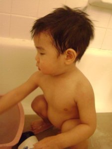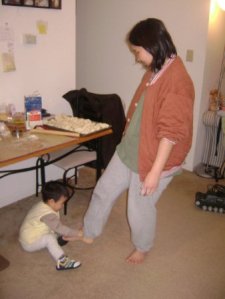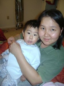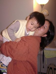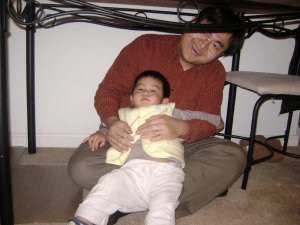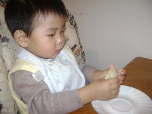 在包的時候, 老公就跟兒子在我的桌底下玩. 兒子還不停的來逗我玩, 一下子又要我抱, 沒想到有人幫忙看小孩還是不能安靜的做事情哩….