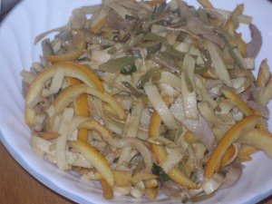 橙皮炒四絲—–這個橙皮我用熱水泡了好多天了. 天天都洗干淨和換熱水泡. 以前我家喜歡吃柚子皮, 這在香港的很多大酒店飯店都有其菜單耶. 但是美國買柚子太貴了, 而這個橙子啊, 皮很厚, 那我就試一下看能不能當一下配菜囉.