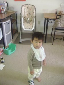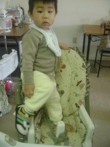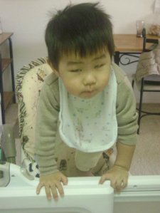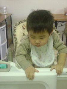 我在廚房忙的時候, 小不點居然把他的高腳椅推到廚房門口, 站上去高高的看我做事情, 他玩得高興, 可是媽媽郤是 惊心動魄的.