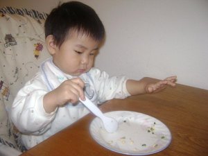 全都是剩菜. 早上烤排骨時把馬鈴薯也扔進去烤. 所以我吃的是早上的. 兒子的嘛….繼續昨天的豆腐囉. 還真乖耶, 幫媽媽把剩菜清光光耶……