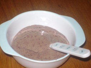 兒子今天的水果泥—–苹果, 酪梨, 藍莓, 香蕉和一點點的蜂蜜….又是吃光光的耶……..