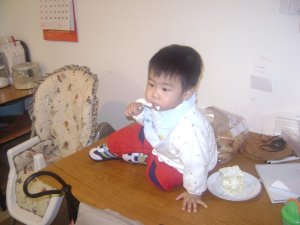 今天切了一塊蛋糕, 喂小不點吃了几口後, 他就愛上了. 他居然會自己從高腳椅上爬上桌偷吃. 真賞臉, 媽媽好高興喔. 下次會再做給你吃的啦……