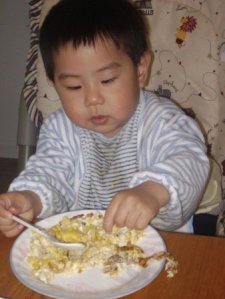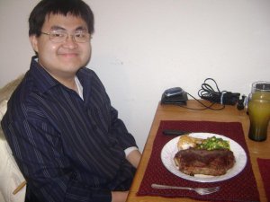 我跟老公吃牛排, 小不點吃炒蛋. 這個牛排實在是太大塊了, 以這個厚度的牛排, 這一塊就已是在外面吃兩客的分量了, 而且自己做我跟老公大人都一玫認為口感更好, 更好吃. 不過這牛排剛上桌時覺得太生了, 又再拿回去再煎一下, 結果又因為要炒小不點的炒蛋, 就把牛排煎得有點老了一點點, 果然一心是不能二用的. 不過老公大人覺得不錯吃耶.