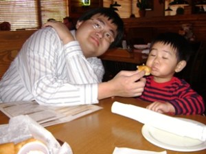 還在跳喔, 把鄰桌的老太太先生們逗得可樂了, 他還不知道從哪里學來這麼多種的動作舞姿, 想是從電視卡通 "the backyeadigans"里學的啦, 這可是他最愛的卡通之一耶……….