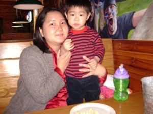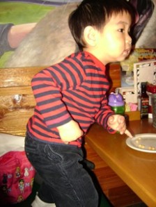 最後啊, 因為小不點在走廊上跳來跳去的, 一不小心就頭撞到桌角了, 起了好大一個包包. 媽媽可沒有因為這樣而心痛呵護, 反而帶他到門外, 惡狠狠的把他教訓了一噸, 再回去才有乖一點點…….