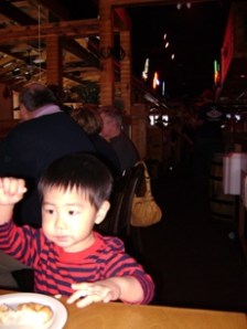 里面的裝潢沒什麼特別的, 就是一般的美式餐廳, 播的是 搖滾的鄉村 音樂. 小不點可愛死那個音樂了, 一進去還在等服務生帶位他就站在門口跳起舞來了. 一坐下來服務生就端來餐包. 早前就听說這餐包很好吃了, 今天一試, 味道還真的不錯, 老公大人特愛, 吃個不停……..