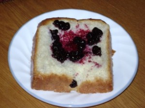 等不及一出爐就立即撕了 "一峰" 配上自製的 藍莓果醬. 好吃, 外皮酥脆, 里面香軟, 管他肥還是胖, 先吃了再說囉…….