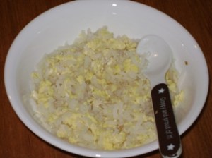 這個小不點第一次把這碗里的飯全吃完, 真是讓我好高興喔. 雖然我是用威脅 + 恐嚇 的手段啦. 只不過嘛, 只要你吃, 我不在乎用什麼手段的啦, 媽媽我是無所不用其極 的啦……