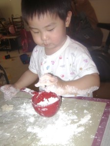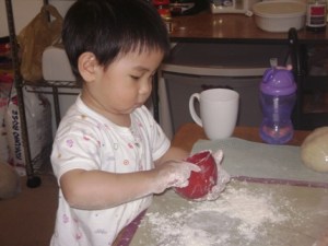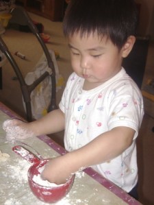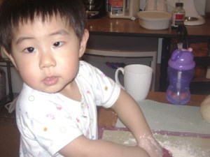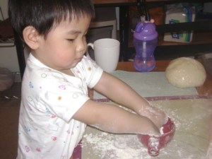 小不點有在 "努力" 的幫忙喔…….這小不點超可愛的, 自己玩面粉, 玩面糰就玩得很開心. 也因為他有參與, 所以在這段時間內他都沒有來打擾我, 很乖喔…….
