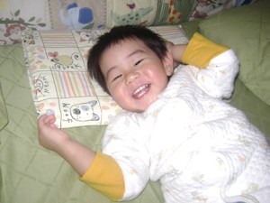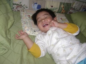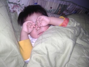 每次我說 躺好, 閉上眼睛睡覺. 他就會把眼睛緊緊閉著或是用手把眼睛矇起來裝睡, 然後偷偷撐開眼睛偷看, 看媽媽有沒有看他, 被他捉到就以為是跟他玩遊戲………. 所有的 "威脅" 都功虧一簣了, 又要重來一次…..最後還要加上一句 "再不睡覺就要打屁股了" 才肯乖乖睡著…….