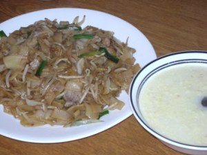 熱油鍋先炒肉絲和綠豆芽菜, 大火快炒即可…….把鍋洗干淨後再熱油鍋炒蒽和洋蒽, 再放河粉, 大火快炒, 然後就入調味料, 老抽, 生抽, 少許酒和一點點醬油膏和一點點糖. ok 上桌囉…..