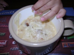 馬鈴薯濃湯……..這雙小手當然是小不點的啦, 他最愛到媽媽碗里覓食了….