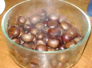 粟子是我的最愛, 而粟子我喜歡用水煮的, 感覺這樣才不會吃起來干巴巴的. 上星期去中國超市買菜時, 見到有好新鮮的粟子喔, 立下就買了2磅回來, 就只是水煮而已, 好粉好新鮮好好吃喔. 我一個人坐下來邊看電視邊啃, 感覺沒有比這更享受的事情了. 最爽的是—-老公大人和小不點都不愛. 哈哈哈……就我一個人吃而已, 沒人跟我搶, 爽翻天了啦…….