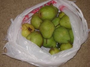上星期居然無意中在我住的社區不遠發現了有顆梨子樹, 樹上結了好多好多的梨子喔…二話不說就跟老公大人去撿啦..(撿是可以, 但是不可以用摘的, 從樹上直接摘會被叫警察的喔….). 第一天我們就只撿到4顆而已, 不多, 但也很滿足了耶….沒想到過几天老公大人再去, 郤是可以撿到十几顆喔, 好多喔……這一大袋是老公大人撿回來的啦, 我還送了几顆給朋友. 實在是太多了, 吃不完啦…..