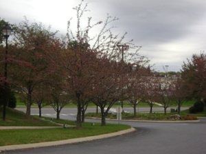 我社區的正門, 這里種了3排的櫻花樹, 春天開花時好漂亮喔. 到了冬天, 樹上郤是結著紅色的果子, 小小顆的像櫻桃………