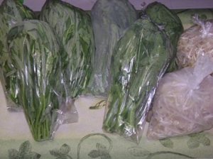 我買了3磅的空心菜和3磅的中國芥藍. 2磅的綠豆芽. 回來全部分裝成所需的量, 這樣就可以進冰箱囉……..