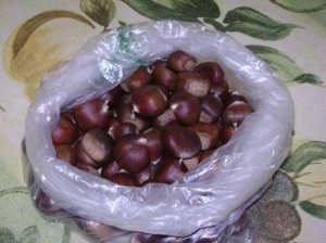 粟子. 這是在我以前上班的超市買的. $2.59/lb.真是貴啊. 可恨的是另一家超市說送貨來的客人說他家的粟子都摘光了, 以後都沒粟子賣了. 迫不得己唯有吃貴的吧. 另一家的粟子是 $1.99/lb……