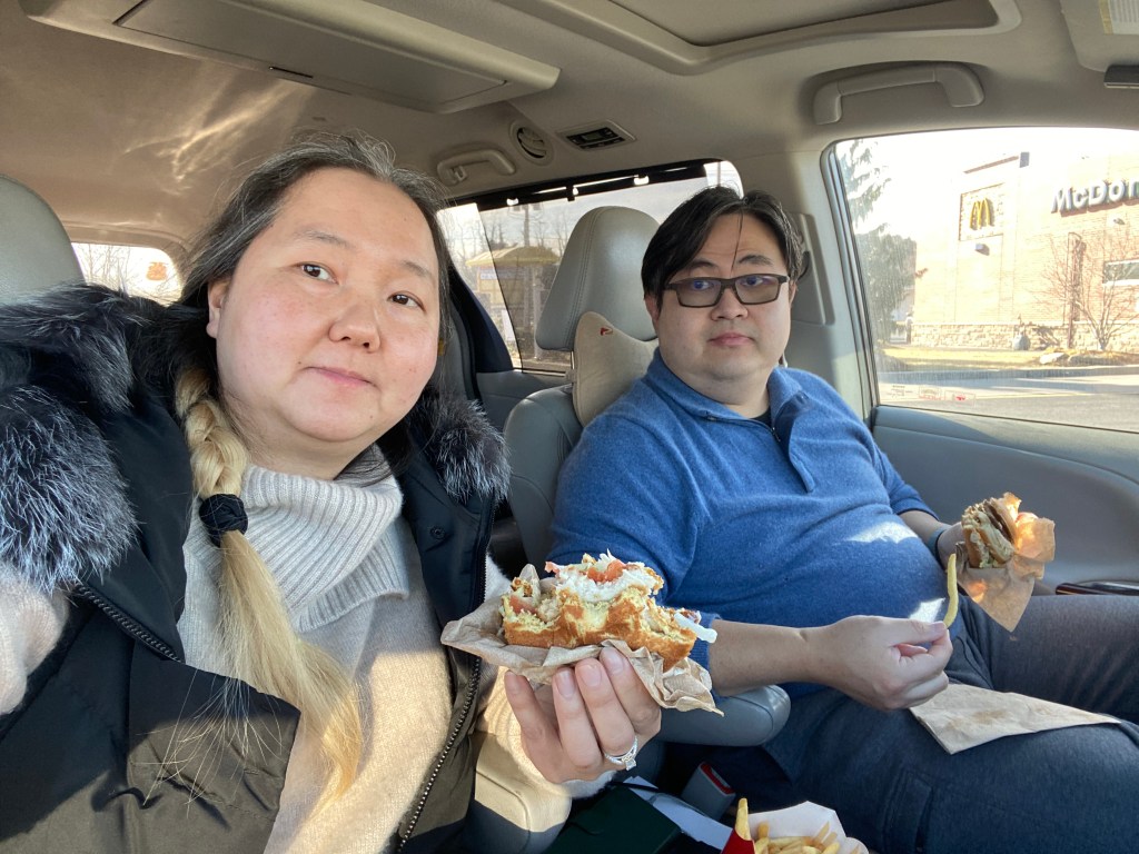 因為疫情的關係, 而我在來著的不久要做手術, 不敢到外面坐下來吃飯, 只能買了 M記 在車上吃, 好餓啊…..
