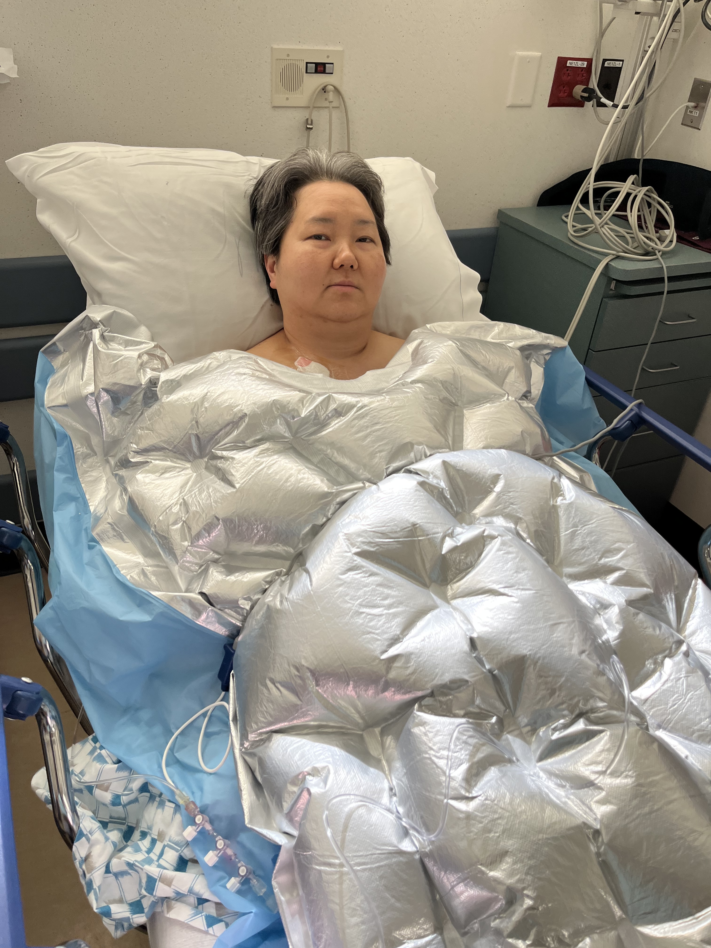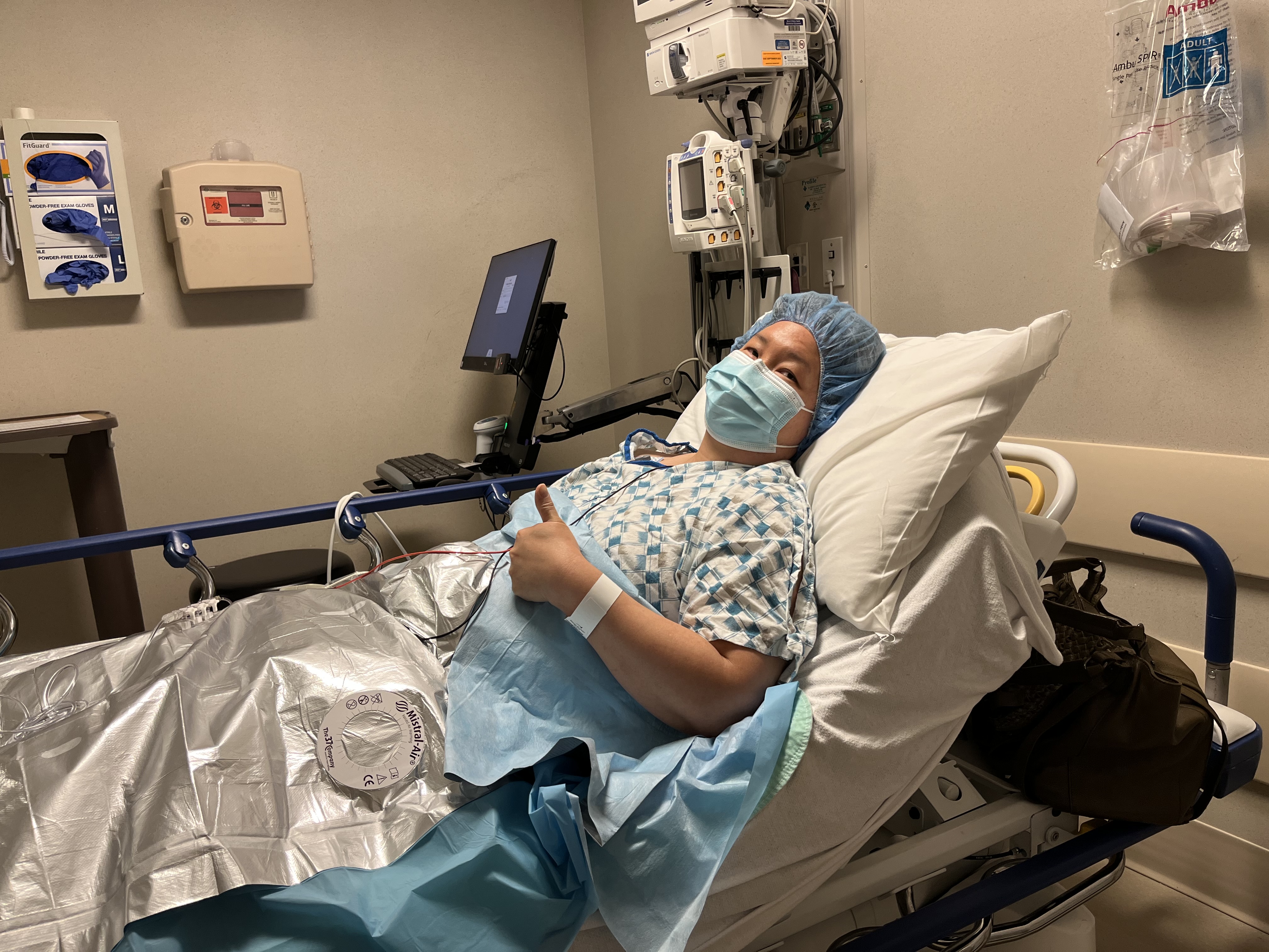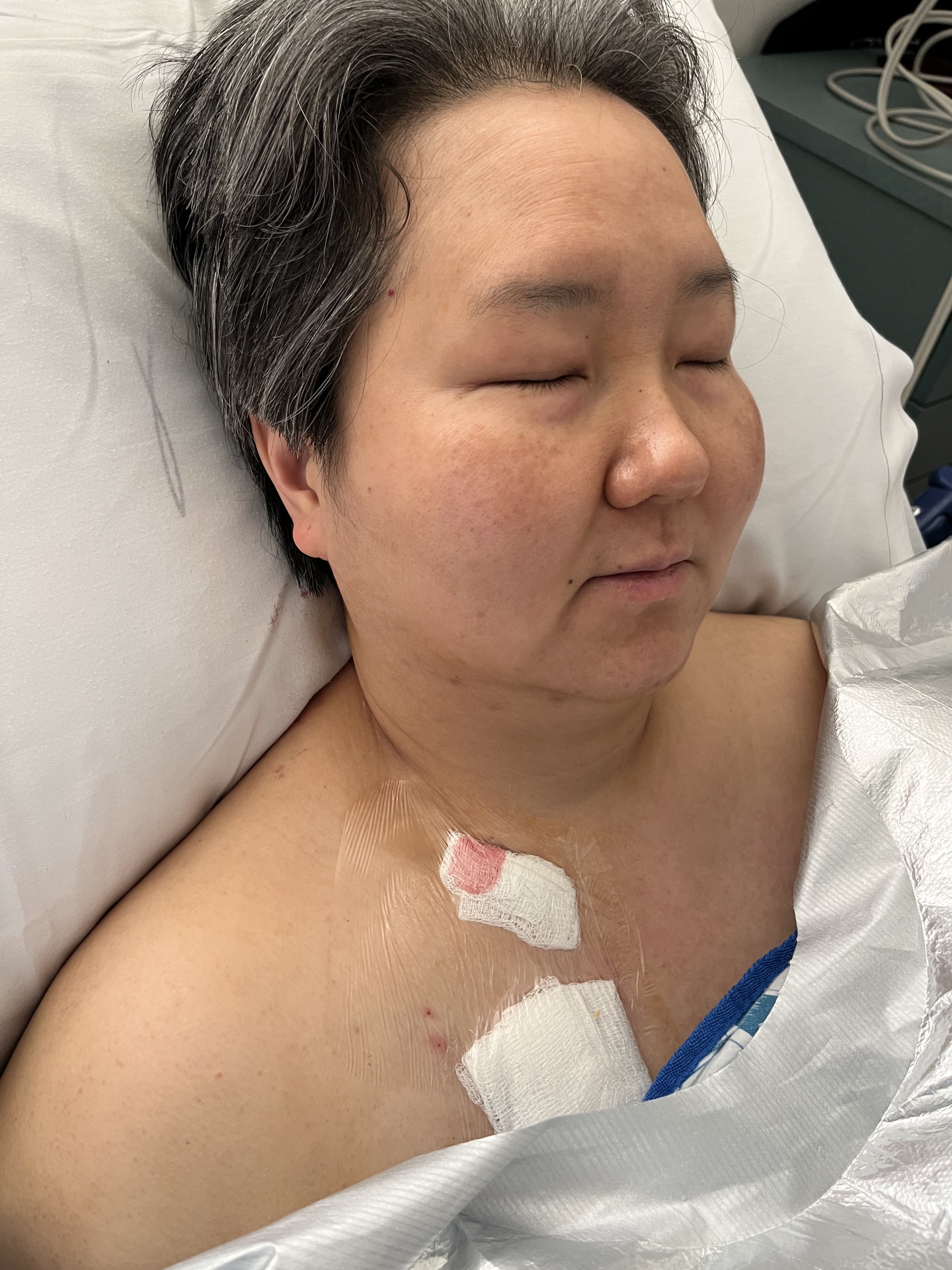 手術算是挺成功的,因為它是一個很小的手術,我雖然是有睡著,但是不算是全麻,因為我有打了一劑的化療了,我的血小板跟紅血球白血球都在降低,所以在手術的時候我有出血了35 CC,我想這個出血量不是大問題啦,個人是覺得每個月的出血量應該都比這個多。 5:30am到達醫院,7:00am被推進手術室,他們把我叫起來的時候是8:30 am, 醒來之後我是整個冷到發抖和傷口很痛,醫護就立刻在我的被子上面打暖氣,所有的醫護都非常好,還發現了原來麻醉醫生是我的客人,他說他常常點我們的外賣。