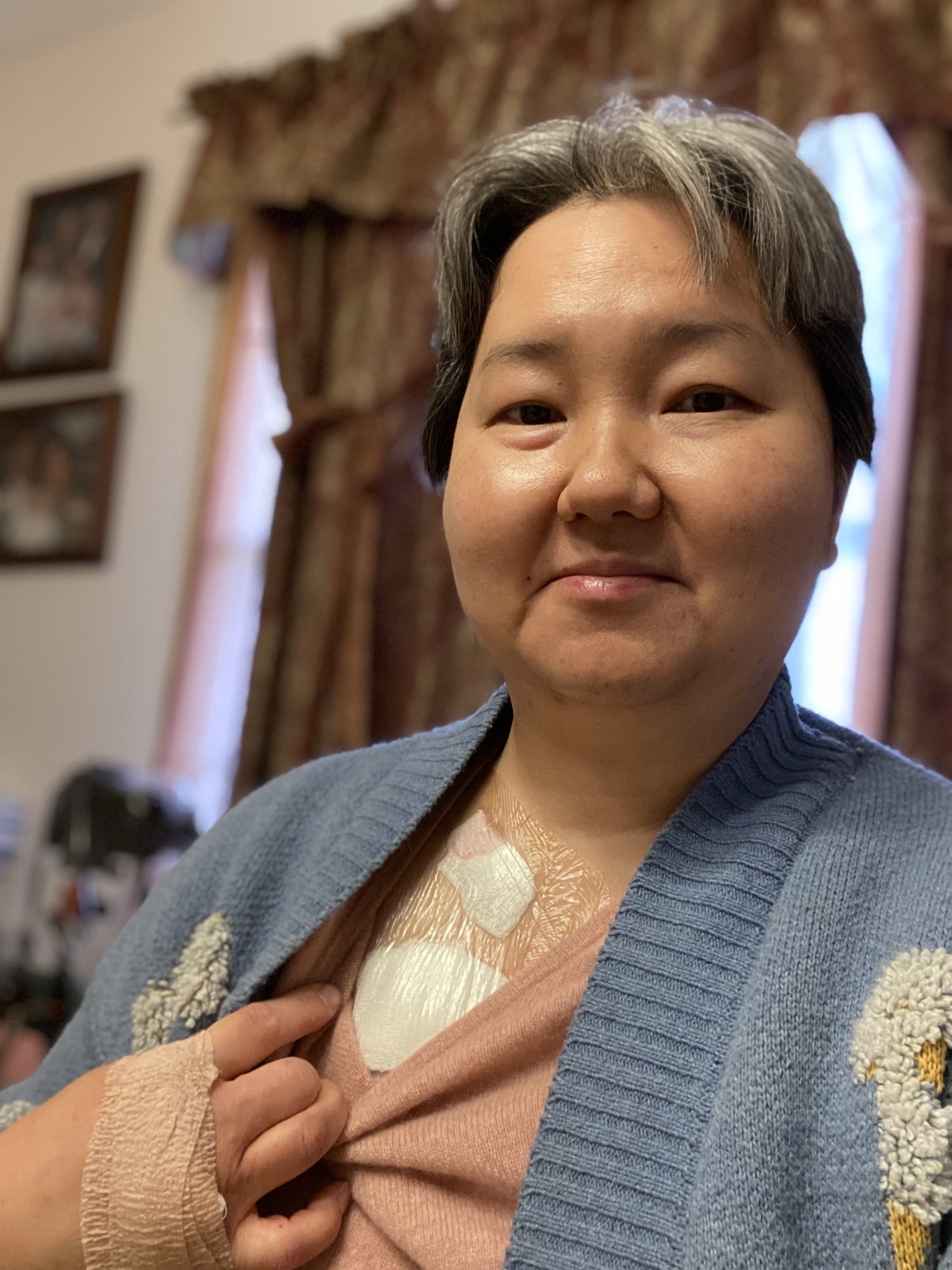 因為化療的藥物非常非常的毒,護士甚至要求我每一次上完廁所都要蓋上蓋子水沖兩次,還最好就是我自己一個人用單獨的衛浴,只要是吐過的東西跟衣服髒了、我都要先戴手套把它先手洗了之後再去洗衣機裡洗,所以這個藥物是非常非常毒的,就因為這樣其實並不建議是在手上的血管打,因為手上的血管很小,這樣子它的藥物就會待在血管裡面太長時間會影響到手的功能,所以醫生就需要在大動脈那裡裝一條人工血管,這樣藥物就很快地直接進入心臟,然後從心臟再分流到全身去了..