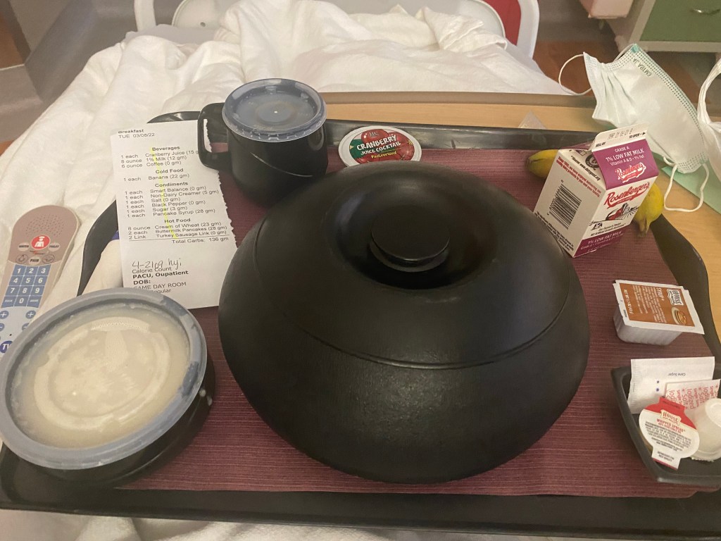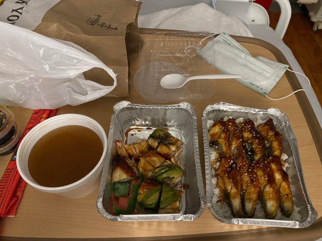 麻酸還沒過, 整個人非常的浮腫, 幸好精神還不錯, 老公帶著我的便當上來病房看我, 幫我把手機和 IPAD 插頭插好, 住置擺好, 讓我可以在晚上醒來時好追劇….