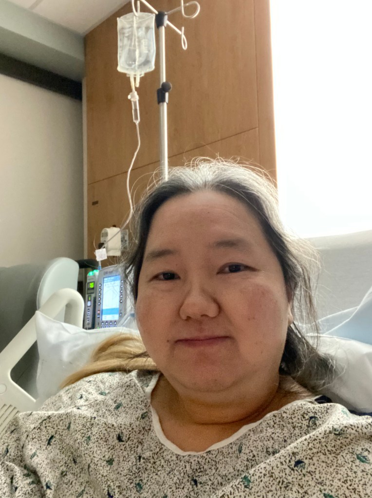 本來我的手術是當天回家的,只是因為我的手術時間被推得太晚了,晚上又下大雨,我的主刀醫生下來跟我老公講我的手術狀況的時候,就跟我老公說可以讓我在醫院裡面多留一個晚上,這樣我們就不用冒雨回家、這樣不安全,所以我就被多留在醫院裡一個晚上,然後我老公就立刻再回去訂酒店…